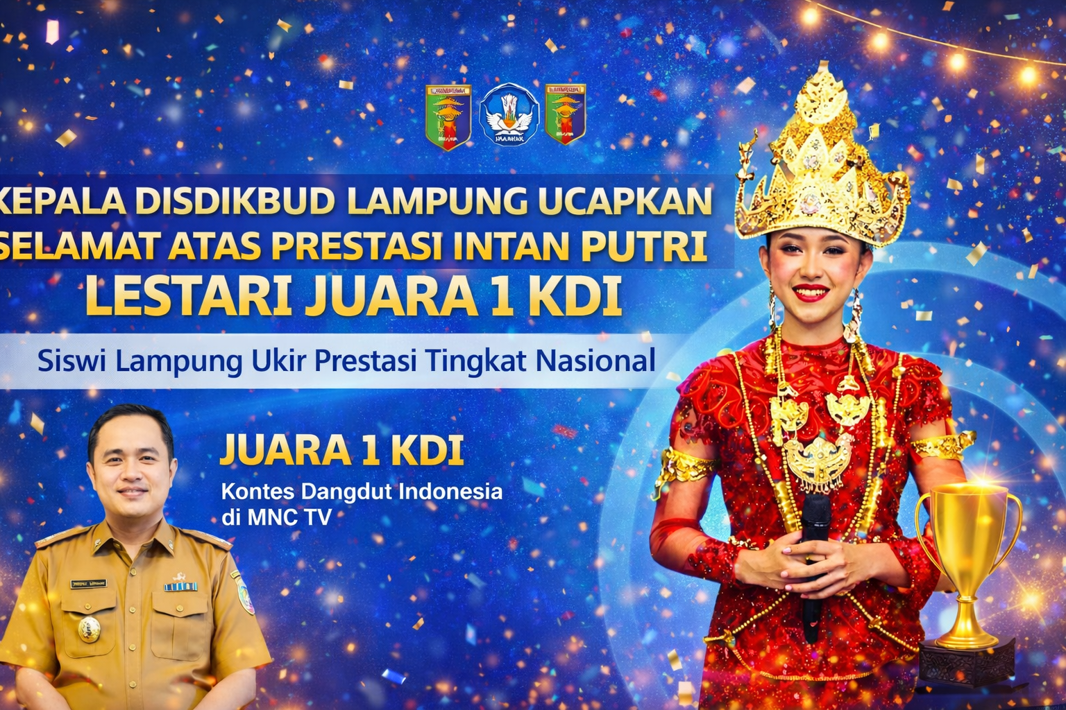 Bandar Lampung, Parlemen Update – Kepala Dinas Pendidikan dan Kebudayaan Provinsi Lampung, Thomas Amirico, menyampaikan ucapan selamat dan apresiasi kepada Intan Putri Lestari, siswi SMA Negeri 1 Sekampung, yang berhasil meraih Juara 1 dalam ajang Kontes Dangdut Indonesia yang disiarkan oleh MNCTV.